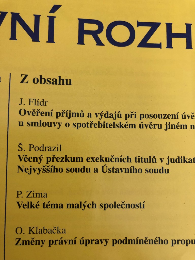 V časopisu Právní rozhledy vyjde do konce roku nový článek týkající se zásadního problému obchodního práva, který zohlední některé prvky novější judikatury z oblasti, kterou se zabývám.