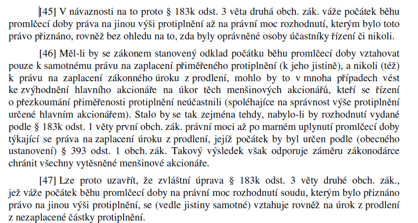 (17. 9. 2024) rozhodnutím ze dne 30. 7. 2024 sp. zn. III. ÚS 39/24-2, Ústavní soud, odmítl stížnost stěžovatelky (společnosti hlavního akcionáře T. Ž.) proti rozhodnutí Nejvyššího soudu sp. zn. 27 Cdo 2245/2022, kterým NS potvrdil právo menšinových akcionářů na úrok z prodlení. Podobně rakouský Nejvyšší soudní dvůr, v rozhodnutí ze dne 12. 5. 2021 sp. zn. 6 Ob 248/20 (bod 68) výslovně uvedl, že „odkaz v § 6 odst. 2 věta 3 GesAusG spočívá v tom, že se na peněžní doplatky zjištěné v přezkumném řízení rozšiřuje povinnost úročení ode dne následujícího po rozhodnutí valné hromady. § 2 odst. 2 GesAusG však také stanoví konečný bod, do kterého tato úroková sazba platí, a to okamžik splatnosti protiplnění. Není pochyb o tom, že za období po tomto datu musí být protiplnění v případě pozdní platby úročena zákonnými úroky z prodlení.
